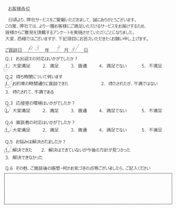 Q1.お出迎えの対応はいかがでしたか? 1.大変満足 Q2.待ち時間について伺います 1.約束の時間通りに面談できた Q3.応接室の環境はいかがでしたか? 1.大変満足 Q4.面談者の対応はいかかでしたか? 1. […]